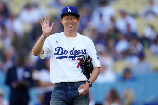 축구 스타 손흥민(33)이 미 메이저리그(MLB) LA 다저스 홈구장 마운드에 섰다.