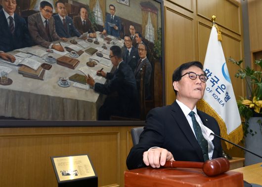 이창용 한국은행 총재가 28일 서울 중구 한국은행에서 열린 금융통화위원회에서 의사봉을 두드리고 있다. 2025.8.28 [사진공동취재단=연합] |