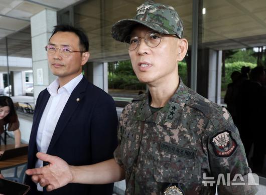 [서울=뉴시스] 조성우 기자 = 평양 무인기 침투 관여 의혹을 받는 김용대 드론작전사령관이 20일 오전 서울 서초구 서울고등검찰청에 마련된 내란특검 사무실에 피의자 신분으로 출석했다가 조사를 중단하고 나와 발언하고 있다. 2025.08.20. xconfind@newsis.com |