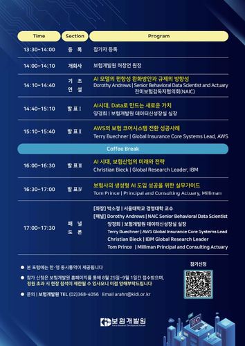 미국보험감독관협의회(NAIC) 관계자가 기조연설에서 규제당국의 관점에서 AI 거버넌스 구축을 위한 움직임과 규제 방향성을 발표하고, 아마존웹서비스(AWS), IBM, 밀리만 등의 전문가들도 참여한다.