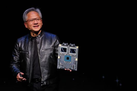젠슨 황 엔비디아 최고경영자(CEO)가 블랙웰 플랫폼을 들고 있는 모습./로이터연합뉴스 |