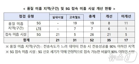 이번에 점검한 52개소 중 26개소는 5G·LTE의 전송속도가 느렸던 '품질 미흡 지역(구간)'이다. 나머지 26개소는 5G의 신호 세기가 약해 안정적인 5G 이용이 곤란했던 '5G 접속 미흡 시설'이다.