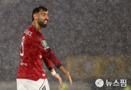 [클리소프스 로이터=뉴스핌] 박상욱 기자= 브루노 페르난데스가 28일(한국시간) 잉글랜드 리그컵 2라운드에서 그림즈비 타운과의 경기 중 난처한 제스처를 취하고 있다. 2025.08.28 psoq1337@newspim.com |