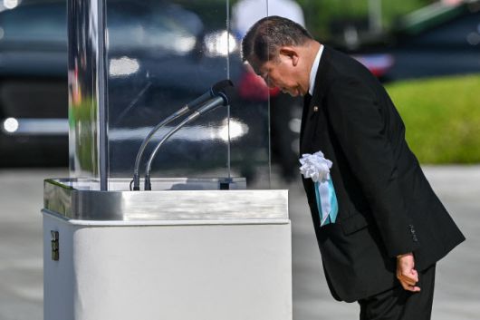 8월 6일, 일본 히로시마시에서 열린 세계 최초 원자폭탄 투하 80주년 평화기념식에서 연설을 마친 뒤 고개 숙여 인사하는 이시바 시게루 일본 총리(사진=AFP) |