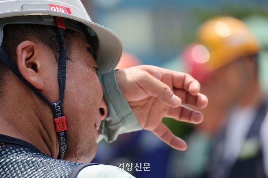 전국건설노동조합원이 지난 7월29일 서울 종로구 국정기획위원회 앞에서 땀을 흘리고 있다. 김창길 기자