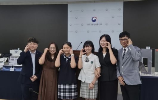 대통령상을 수상한 이정민 인천과고 3학년 학생과 국무총리상을 수상한 엄주연 대전어은중 1학년 학생이 가족과 함께 세종정부청사 브리핑장에서 기념사진을 촬영하고 있다. /사진=과학기술정보통신부/사진=박건희 기자 |