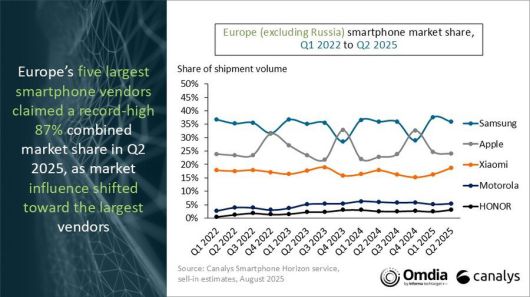 시장조사업체 카날리스는 28일 2025년 2분기 기준 유럽(러시아 제외) 스마트폰 시장 출하량은 전년 동기 대비 9% 감소한 2870만 대를 기록했다고 밝혔다.