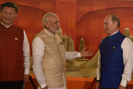 2016년 브릭스 정상회의 주최국인 인도의 나렌드라 모디 총리가 푸틴 대통령과 시진핑 주석을 환대하고 있다. |