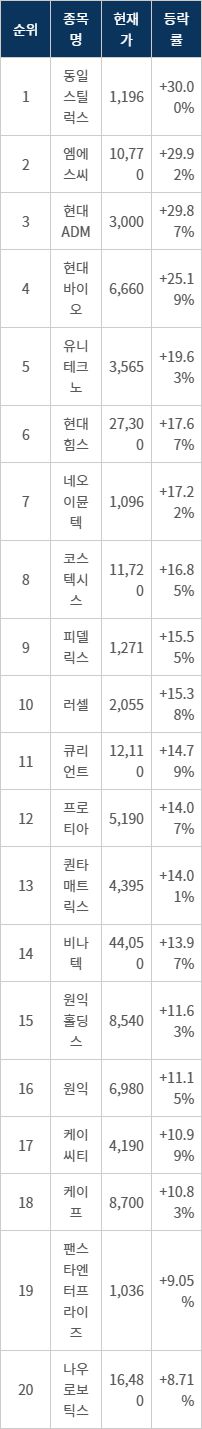 6위 현대힘스(460930)는 종가 27,300원으로 17.67% 급등 마감했다. 7위 네오이뮨텍(950220)은 종가 1,096원으로 17.22% 급등 마감했다. 8위 코스텍시스(355150)는 종가 11,720원으로 16.85% 급등 마감했다. 9위 피델릭스(032580)는 종가 1,271원으로 15.55% 급등 마감했다. 10위 러셀(217500)은 종가 2,055원으로 15.38% 급등 마감했다.