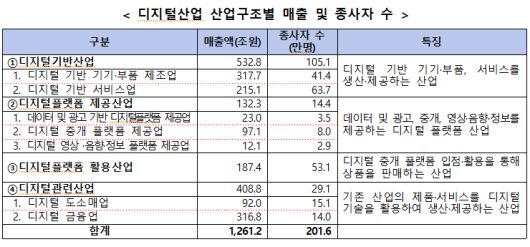 종사자 수는 202만 명으로 전체 산업(2545만 명)의 7.9%를 차지했다. 산업 대분류별로는 ▲디지털기반산업(532.8조 원) ▲디지털관련산업(408.8조 원) ▲디지털플랫폼 활용산업(187.4조 원) ▲디지털플랫폼 제공산업(132.3조 원) 순이었다. 중분류에서는 디지털 기반 기기·부품 제조업(317.7조 원), 디지털 금융업(316.8조 원), 디지털 기반 서비스업(215.1조 원)이 상위를 차지했다.
