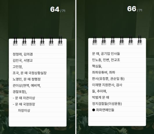 ‘수거 대상’, 즉 체포 대상에서 가장 많이 등장하는 표현은 ‘문 때’로 ‘문재인 정부 때’의 줄임말로 해석되며 총 11회 등장한다. ‘문 때 차관 이상’, ‘문 때 국정원장’ 등 문재인 정부에서 근무했던 사람들을 특정해 체포 대상에 포함시켰다. 반대 세력에는 ‘좌파’라는 딱지를 붙여 분류했다. 66쪽에는 ‘좌파 유튜버’부터 ‘좌파 판사’, ‘좌파 연예인들’이 수거 대상에 포함됐다.A급은 연평도, B~D급은 별도 수집소