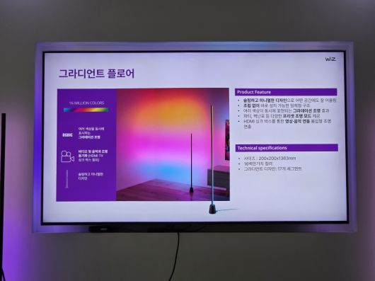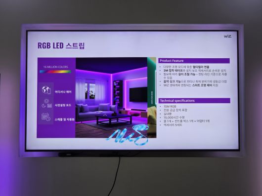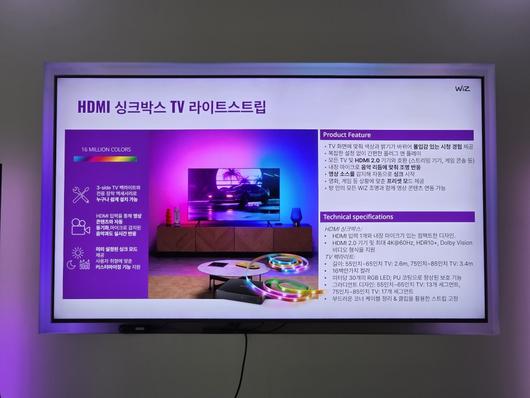 이번 발표회의 핵심 제품 중 하나인 '위즈 HDMI 싱크박스 TV 라이트스트립'에 대한 소개가 진행됐다. 이 제품은 55~65인치용과 75~85인치용으로 출시됐으며, 어떤 제품을 구매해도 별도의 추가적인 구매 없이 바로 사용이 가능하다. 필립스 휴의 경우 싱크박스(또는 삼성 및 LG TV용 앱)와 조명, 그리고 허브 역할을 하는 휴 브릿지가 필요했던 만큼 접근성이 상당히 낮아진 제품이라고 볼 수 있다. 가격은 55~65인치용이 169,000원, 75~85인치용은 189,000원으로 가격 접근성 역시 매우 좋은 것을 확인할 수 있다.