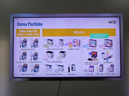 국내 시장에 출시된 위즈 브랜드의 전제 포토폴리오를 한 눈에 확인할 수 있었다. 이 중 E14 TW 캔들과 RGB GU10 글래스는 2025년 연말 출시 예정이다. 필립스 스마트 LED의 경우 위즈 앱을 통해 제어가 가능해 사실상 위즈 전구로 봐도 무방하다. 초기에 출시된 스마트 전구 제품에서는 '필립스 스마트 LED'가 더 강조되었는데, 이는 LED 조명 시장에서 필립스의 네임 밸류를 고려한 출시 전략이 반양된 결과다. 초기에 출시된 스마트 전구류를 제외하면 위즈 브랜드로 출시된다.