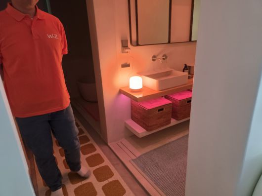 화장실 공간에서는 Wi-Fi 기반의 스페이스 센스 기능이 작동 중이었다. 별도의 모션 센서 없이 위즈 조명만으로 움직임을 감지한 자동화 시나리오가 운영 중에 있었다. 밤 중에 화장실을 갈 경우 위즈 조명이 움직임을 감지해 자동으로 조명이 켜지게 하는 식의 사용이 가능하다. 사람이 떠나면 조명이 꺼지는 것도 가능하기 때문에 재실 센서의 역할도 수행한다고 볼 수 있다.