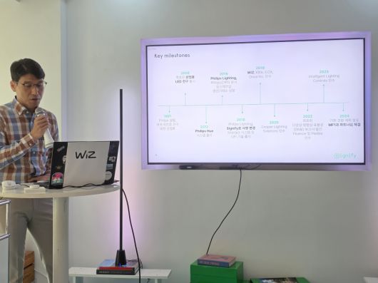 이규한 대표 이사는 "시그니파이는 2024년 기준 한화로 약 10조에 달하는 매출을 기록한 기업이며, 70여개 국가에서 29,000여명의 임직원이 함께하고 있다. 1891년 필립스가 설립된 이후 세계 최초로 전구를 대량 상업화했으며, 2008년에는 최초의 상업용 LED 전구를 출시했다. LED 조명 분야에서만 30여년의 긴 역사를 보유한 기업이라고 볼 수 있다."라며, 시그니파이의 역사를 소개했다.