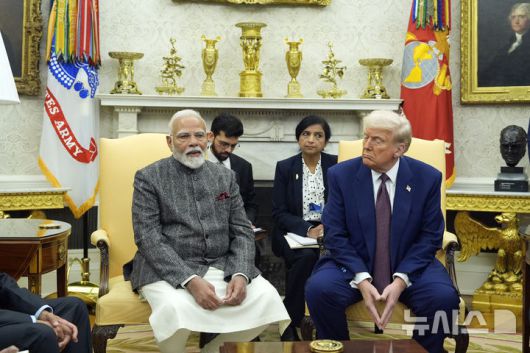 [워싱턴=AP/뉴시스] 27일(현지 시간) 뉴욕타임스(NYT), 가디언에 따르면 세계 최대 섬유·의류 수출국인 인도 업계는 "지금은 사실상 멈춤 상태"라며 관세 충격을 호소했다. 미국 바이어들은 관세 충격에 대비해 사전에 원단과 의류 재고를 확보했지만, 이후 신규 발주는 중단된 상태다. 사진은 도널드 트럼프(오른쪽) 미국 대통령과 나렌드라 모디 인도 총리가 지난 2월 13일(현지 시간) 백악관 집무실에서 회담하고 있다. 2025.08.28. |