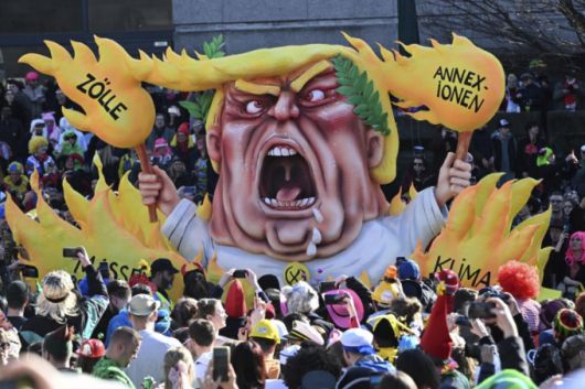 지난 3월3일(현지 시간) 독일 뒤셀도르프에서 열린 전통 로즈 먼데이 카니발 퍼레이드에서 사람들이 도널드 트럼프 미국 대통령을 묘사한 카니발 조형물을 사진 찍고 있다. 불길에 휩싸인 트럼프 대통령의 모습을 한 조형물에는 '병합, 관세, 기후 파괴, 대규모 추방' 등의 문구가 적혀 있다. /AP=뉴시스 |