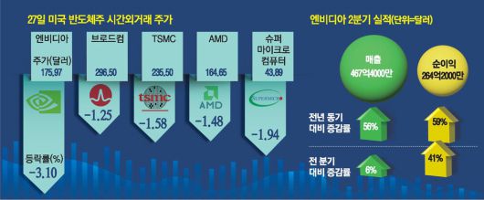 인공지능(AI) 칩 시장을 이끌고 있는 엔비디아가 올 2분기(5~7월) 시장 예상치를 소폭 상회하는 사상 최대 실적을 발표했음에도 시간외거래에서 주가가 3% 이상 하락했다. 시장은 미국 정부의 대중 수출 규제 탓에 2분기 중국용 주력 칩 매출이 사실상 전무했고, 3분기 전망에서도 중국 판매를 배제하는 등 중국 시장에 대한 불확실성 우려에 주목한 것으로 분석된다.