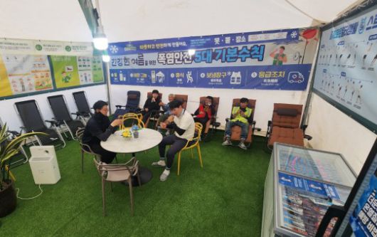 롯데건설 현장의 근로자들이 냉방장치와 차가운 음료, 빙과류가 마련된 휴게공간에서 휴식 중이다./사진제공=롯데건설 |