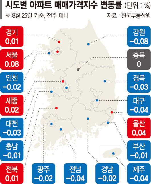 반면 광진구(0.09%→0.18%)와 성동구(0.15%→0.19%)는 상승폭이 확대됐고, 마포구(0.06%→0.08%)도 오름세가 이어졌다. 이외에도 동대문·노원·도봉·강북·관악 등이 상승폭을 키웠고, 중랑·서대문·강서·구로·동작구는 전주 수준을 유지했다. 수도권 아파트값은 0.03%로 전주와 같은 상승폭을 보였다. 경기는 0.01%로 상승 전환했고, 인천은 -0.01% 하락해 전주(-0.02%)보다 하락폭이 줄었다. 지방은 -0.02%로 하락폭을 유지했고, 세종은 0.02%로 상승 전환했다.