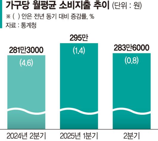 28일 통계청이 내놓은 '2025년 2·4분기 가계동향조사 결과'에 따르면 2·4분기 가구당 월평균 소비지출은 283만6000원으로 전년 동기 대비 0.8% 증가했다.