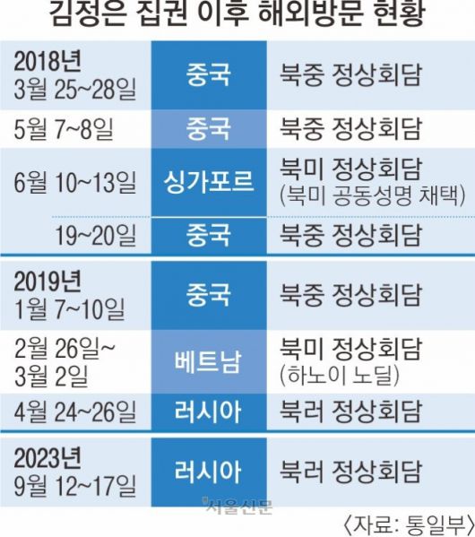 지난해 수교 75주년을 맞은 북한과 중국은 몇 년 새 급격한 북러 밀착으로 관계가 다소 소원해졌다가 올해 초부터 다시 교류가 재개되는 분위기였다. 김 위원장의 이번 방중은 2018년 세 차례, 2019년 한 차례에 이어 다섯 번째다.