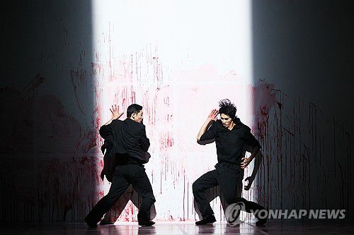 (서울=연합뉴스) 임순현 기자 = 새하얀 무대가 난무하는 폭력에 피범벅이 된다. 검은 복장의 사내들이 바닥과 벽을 열심히 닦아내자 무대는 조금씩 '핑크' 빛으로 변해간다. 직접적이고 원시적인 안무를 통해 폭력이라는 인간의 본성을 들여다보는 19금 잔혹 무용공연 '핑크'(pink)의 무대 모습이다.