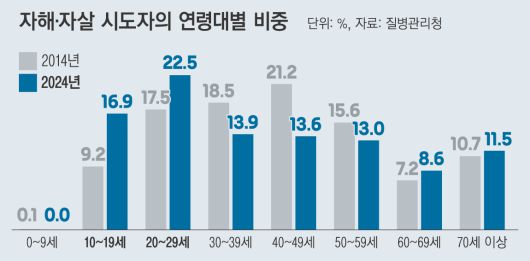 자해·자살 시도 이유로는 우울증과 같은 정신과적 문제(45.6%)가 가장 많았다. 질병청은 “청장년층에서 정신건강 문제가 심각한 수준으로 확산되고 있으며, 개인의 영역을 넘어 사회적 차원의 자살 예방 정책이 시급함을 보여준다”고 했다.