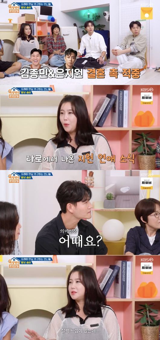 김숙은 “얼굴만 봐도 촉이 오냐”라고 궁금해했고, 솔비는 “종민 오빠를 만났는데 오빠 느낌이 이상하더라. 뭔가 떼꼼한(?) 얼굴이 있다. 뭔가 얼굴에 화색이 있더라. 그런 게 느껴졌다”라고 답했다.