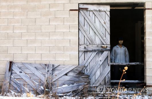 강원 태백시 탄광사택촌의 배급소 문짝이 떨어져 있다. 연합뉴스 |