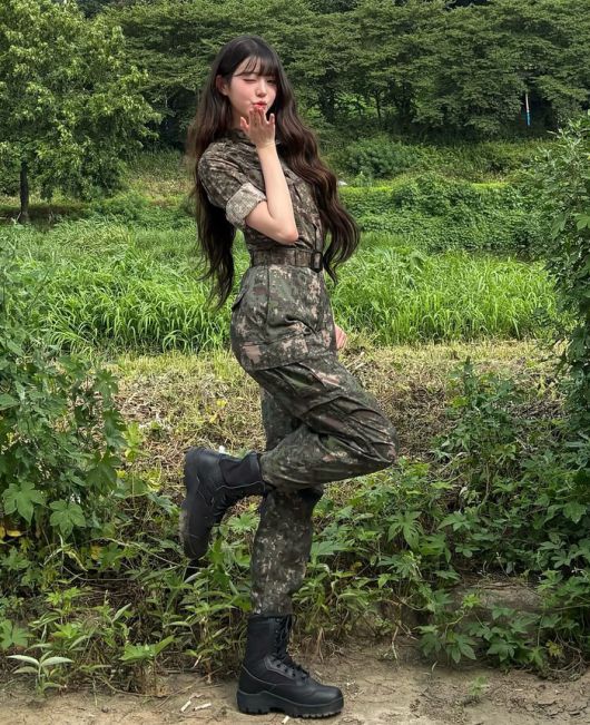 공개된 사진 속 장원영은 위장무늬 군복 차림으로 경례 동작과 다양한 포즈를 취하고 있다.
