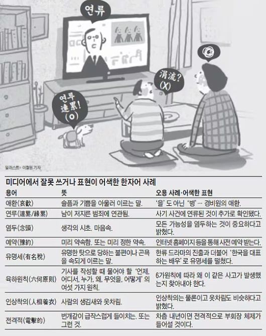 단어의 한자를 모르다 보니 발음이 비슷한 엉뚱한 표기가 기사에 버젓이 노출되기도 한다. “걸그룹 전 멤버가 마약 사건에 연류됐다고 전해졌다”는 한 인터넷 기사의 문장에서 ‘연류’는 무슨 뜻일까? ‘표준국어대사전’에는 ‘연류(涓流·작은 흐름)’와 ‘연류(連類·하나의 무리를 이룬 동아리)’라는 두 단어가 등재돼 있지만, 이 문장에선 모두 뜻이 통하지 않는다. 이 말은 ‘남이 저지른 범죄에 연관됨’이란 뜻을 지닌 ‘연루(連累/緣累)’를 잘못 쓴 것이다.