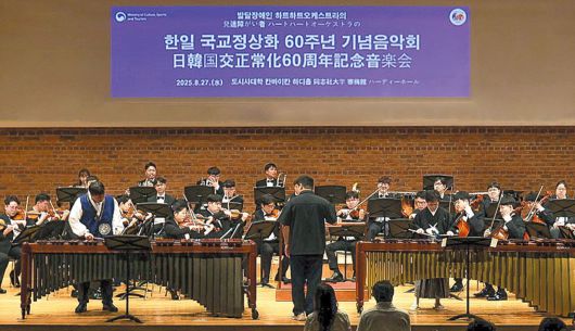 한일(韓日) 장애인 연주자들이 국교 정상화 60주년을 맞아, 윤동주 시인의 모교인 도시샤대에서 만나 협연했다. 세계에서 유일하게 전원이 발달장애인으로 구성된 한국 하트하트오케스트라가 음악을 통한 한일 우호를 바라며 펼친 일본 투어 공연 중 하나다. 이번 투어는 25·26일 오사카, 27일 교토, 28일 나라에서 총 5차례 열렸다. 27일 도시샤대 공연은 윤동주 시비(詩碑) 헌화와 그의 시 ‘별 헤는 밤’ 연주가 있어 특별했다. 바리톤 김수한은 굵은 목소리로 “자랑스러운 풀이 무성할 거외다”라는 시구를 노래해 한일 관계에서 아픈 과거인 윤동주 시인의 죽음을 기렸다.