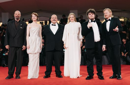 28일 밤(현지시각) 제82회 베네치아국제영화제 경쟁 부문 \'부고니아\'의 공식 상영 직전 요르고스 란티모스 감독(맨 오른쪽)과 주연배우들이 레드 카펫에서 포즈를 취하고 있다. 포커스피처스, 프레먼틀, 씨제이이엔엠 제공 |