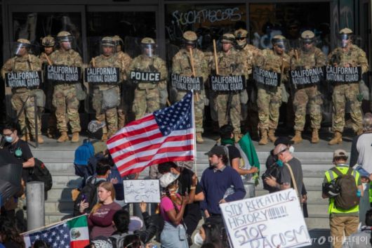 지난 6월일 로스앤젤레스에서 이민세관단속국의 불법 이민자 단속 에 반대하는 시위대가 연방 건물 밖에서 경비를 서고 있는 캘리포니아 주방위군을 향해 피켓과 깃발을 들고 있다. /LA AFP=뉴스1 |