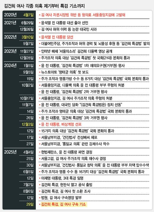 공적인 대통령의 지위를 동원하며 남편이 시간을 벌어준 사이에 김 여사 관련 의혹은 눈덩이처럼 불어만 갔고 이를 파헤치겠다는 특검법은 더욱 강력해졌다. 차곡차곡 쌓인 김 여사 관련 의혹은 모두 16가지. 고스란히 특검법에 명기됐고 민중기 특별검사팀은 올해 7월2일 수사를 드디어 개시했다.