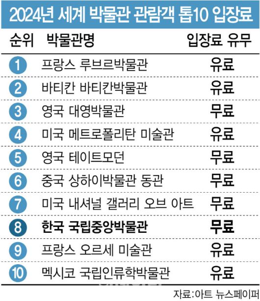 프랑스 루브르박물관은 2025년 기준 성인 입장료가 22유로(약 3만 6000원)다. 바티칸박물관은 일반 입장권이 20유로(약 3만 2000원)에 달한다. 대신 이들 박물관은 어린이와 학생, 또는 장애인 등에 대한 무료입장 제도를 운영하고 있다. 이들 외에 △미국 메트로폴리탄 미술관(30달러·약 4만 1000원) △프랑스 오르세 미술관(16유로·약 2만 6000원) △멕시코 국립 인류학박물관(100멕시코페소·약 7000원) 등도 유료 정책을 고수하고 있다.
