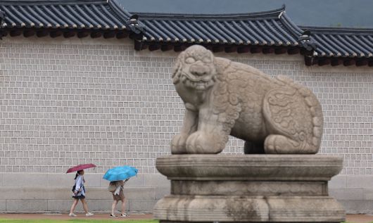 서울 종로구 경복궁을 찾은 관광객들이 우산을 쓰고 걷고 있다. 뉴스1 |