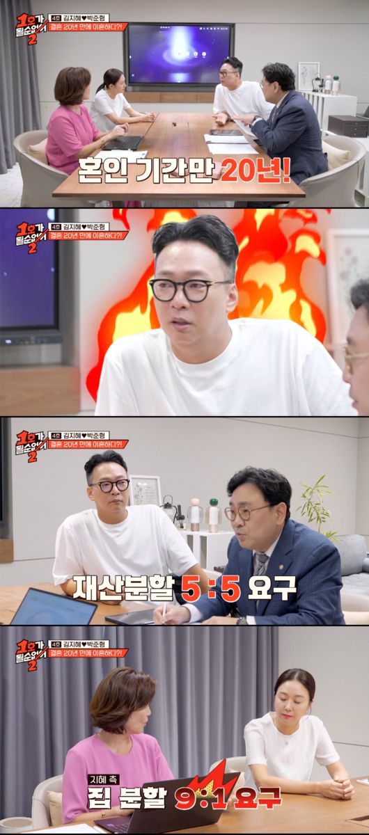 [OSEN=박근희 기자] '1호가 될 순 없어2’ 김지혜가 남편 박준형과의 가상 이혼 체험에서 20년간의 결혼 생활에 대한 충격적인 진실을 폭로했다.