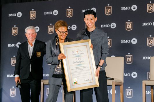 캐런 배스 LA시장과 LA 명예 시민 손흥민 선수. 사진 | LA관광청 |