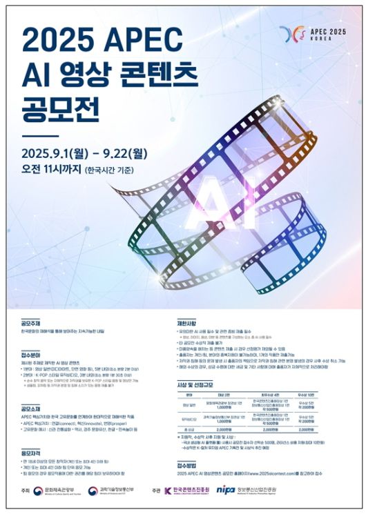 문화체육관광부와 과학기술정보통신부는 한국콘텐츠진흥원, 정보통신산업진흥원과 함께 오는 9월 1~22일 ‘2025 아시아태평양경제협력체(APEC) 정상회의 계기 인공지능(AI) 영상콘텐츠 공모전’을 개최한다고 문체부가 29일 밝혔다.