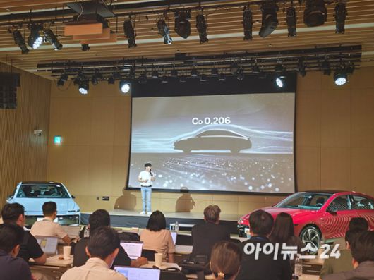 현대차 연구원이 28일 경기도 고양 현대모터스튜디오 고양에서 열린 '더 뉴 아이오닉 6 테크토크' 행사에서 차량에 적용된 기술에 대해 설명하고 있다. [사진=김종성 기자] |
