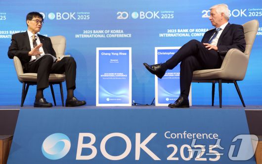 이챵용 한국은행 총재와 크리스토퍼 월러 미국 연방준비제도 이사가 지난 6월 2일 오전 서울 중구 한국은행 신축별관 컨퍼런스홀에서 열린 'BOK 국제컨퍼런스'에서 대담을 하고 있다. 2025.6.2/뉴스1 ⓒ News1 김명섭 기자 |
