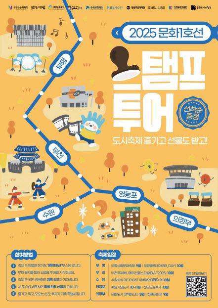 [이데일리 이윤정 기자] 의정부문화재단은 수도권 1호선 라인을 따라 펼쳐지는 특별한 문화여행 ‘문화1호선 스탬프투어’를 오는 8월부터 11월까지 의정부, 부평, 부천, 영등포, 수원 5개 법정문화도시 축제 현장에서 운영한다. 각 도시의 대표 축제 현장에 마련된 ‘문화1호선 부스’를 방문하면 축제를 즐기는 동시에 스탬프 투어에 참여할 수 있다.