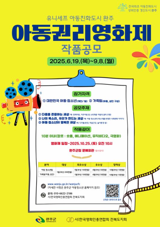 (완주=국제뉴스) 송영심 기자 = 유니세프 아동친화도시 완주군이 '2025 완주 아동권리영화제'에 상영될 작품을 공모한다.