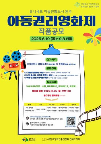 (전주=연합뉴스) 최영수 기자 = 유니세프 아동친화도시인 전북 완주군은 '완주 아동권리영화제'에서 상영할 작품을 9월 8일까지 공모한다고 29일 밝혔다.