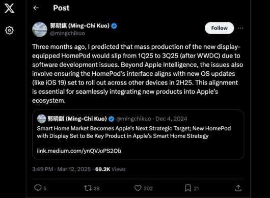 밍치 쿠오는 2023년 3월, 애플이 7인치 화면을 갖춘 재설계된 홈팟을 개발 중이며, 이를 통해 애플의 다른 기기와 더 긴밀한 통합이 가능해질 것이라고 언급했다. 당시 그는 출시 시점을 2024년 상반기로 예상했으나, 이후 2024년 12월에는 해당 일정이 2025년 개발자 콘퍼런스 이후로 미뤄졌다고 수정했다. 그는 이 지연이 소프트웨어 개발 지연 때문이라고 분석했다.