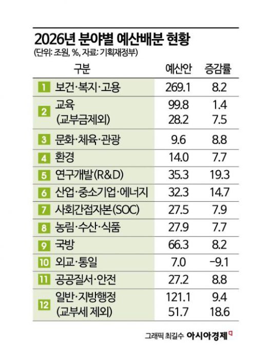 12대 분야별로 보면 내년도 국방 예산은 66조3000억원으로 올해 대비 5조원(8.2%) 증액했다. 보수, 급식, 훈련 등 장병 인적투자를 전방위 확대하고 최첨단 무기체계 전환과 K방산을 육성한다. 사회간접자본(SOC) 예산은 27조5000억원으로 증액돼 교통·물류망 강화와 5극3특 중심의 지역 균형발전 기반 확충에 투입된다. 행정수도 완성을 위한 국회 세종의사당 설계 착수 예산 역시 올해 350억원에서 내년 956억원으로 확대한다.