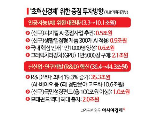 정부가 내년 AI 분야에 10조1000억원의 예산을 편성해 'AI 3대 강국' 도약에 나선다. 연구개발(R&D) 분야에는 역대 최대 규모인 35조3000억원을 투자해 미래 성장 동력 선점을 위한 기술개발을 추진한다. 5년간 100조원 이상의 국민성장펀드를 신규 조성해 첨단 전략산업 분야를 끌어갈 유망기업을 육성한다.