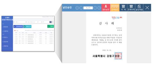 방문 날인과 인쇄 날인으로 나뉘어 있던 신청 창구가 하나의 전자 창구로 통합됐다. 각 부서는 내부 행정 시스템에서 날인을 신청할 수 있다. 담당 부서의 승인 후 공인 이미지를 전자문서에 바로 찍을 수 있다. 날인 이력은 시스템 데이터베이스에 실시간 저장·관리된다.